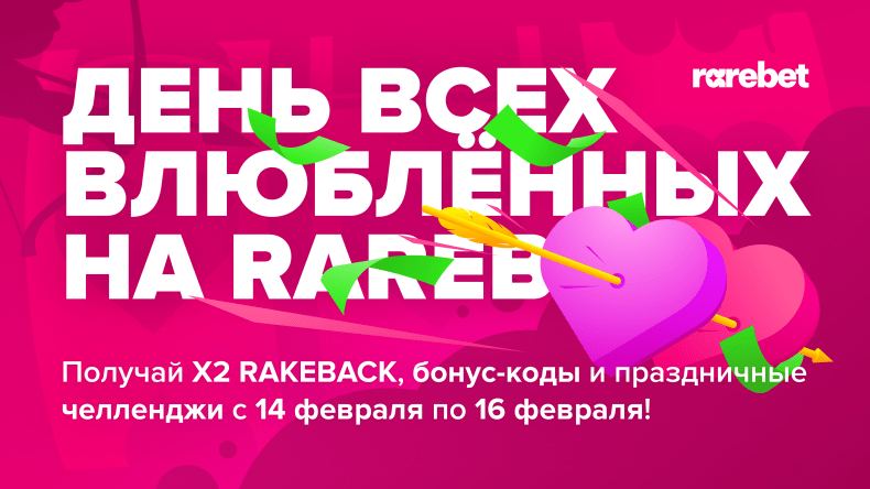 Любовь витает в воздухе, а вместе с ней — потрясающие награды на Rarebet! С 🕒 14 февраля по 16 февраля мы разогреваем атмосферу 🔥 горячими праздничными предложениями ко 💘 Дню всех влюблённых.